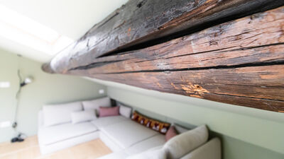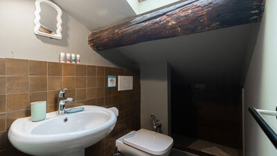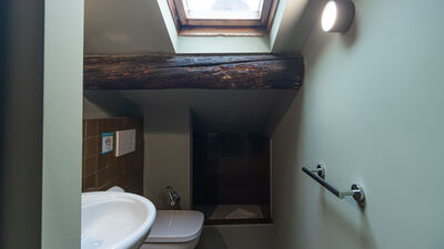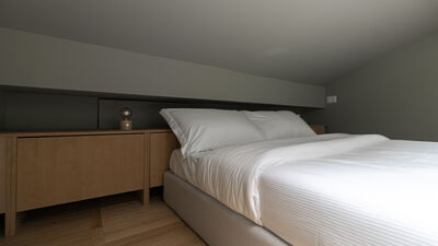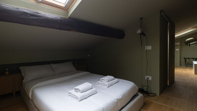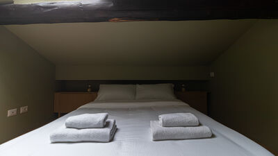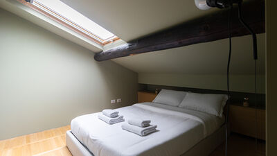 Eine Holztreppe führt in das obere Dachgeschoss, das dank der offenen Struktur und des Charmes des Dachbodens zu einem idealen Bereich für dynamische und abenteuerlustige Menschen führt. Hier finden Sie das Schlafzimmer mit einem 140 cm großen Doppelbett, ein helles Wohnzimmer mit einem geräumigen und bequemen Sofa, das in ein Einzelschlafsofa für bis zu drei Personen umgewandelt werden kann, einen Smart-TV und ein zweites Badezimmer mit Dusche im unteren Teil des Dachbodens — ein kleiner Raum mit einem schönen und intimen Charakter, perfekt für diejenigen, die Originalität lieben.