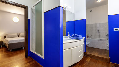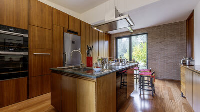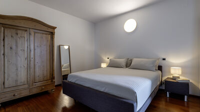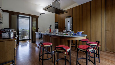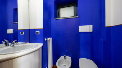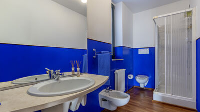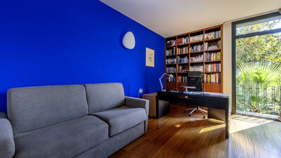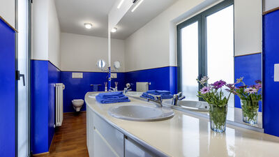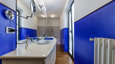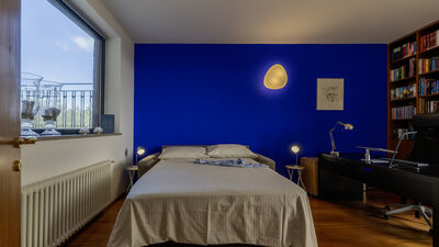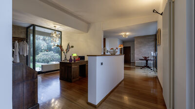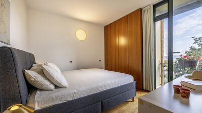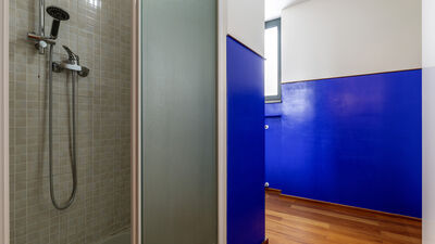 Die etwa 700 Quadratmeter große Villa erstreckt sich über drei Hauptebenen, die von Zwischengeschossen durchsetzt sind und durch eine interne Treppe miteinander verbunden sind. ERDGESCHOSS — Wohnbereich mit offenem, von Fenstern gesäumtem Korridor, der zum großen Wohnzimmer mit Wohnzimmer und Esstisch führt, mit direktem Zugang zum Garten und Essbereich im Freien; Küche mit direktem Zugang nach draußen; Servicebad; Arbeitszimmer mit Doppelschlafsofa (1,40 m breit) für zwei zusätzliche Betten; einige Stufen (7) führen zu einem Doppelzimmer mit eigenem Bad mit Badewanne und Dusche und direktem Zugang zu einem kleinen Balkon. ERSTER STOCK — Schlafzimmer mit Doppelbett; Badezimmer mit Dusche; Zugang zur Panoramaterrasse; Doppelzimmer mit eigenem Bad mit Badewanne. UNTERGESCHOSS — Großer Freizeitraum mit privater Bibliothek, Tischtennisplatte, Spielen und Ausgängen zum Garten und Pool; Servicebad und zwei Duschen; Waschküche mit Waschmaschine und Trockner; Garage. Klimaanlage in den Schlafzimmern